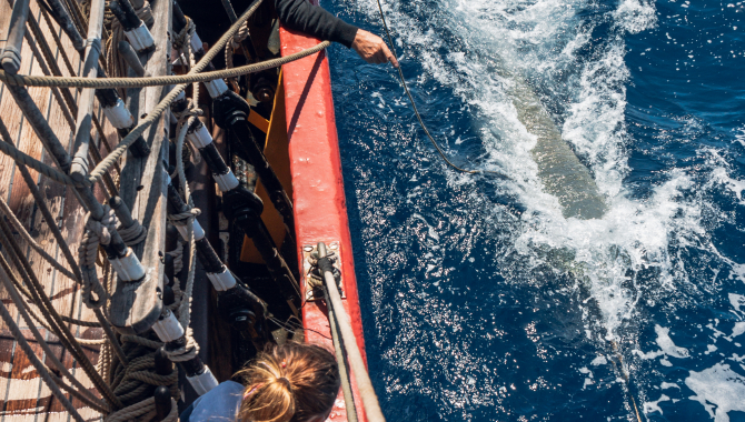 Goodevening,POS: 12'06 N 023'26WCRS: 215'SPD: 4,2ktsWND: NE 3bftSEA: SlightSWL: NE LowRain, a lot of water pouring down out of showers that come over in a tropical wave. Shifting winds, but not that strong, in fact even welcome, so we can make some way.Later we could do some plastic trawling, all for science. Not much visible plastic however. Maybe under the microscope.Windwise the forecast does not look too good. Very light winds if any. Most likely we will hear the caterpillars coming days. For the first time this trip. Hopefully not too long.Rgds, Arian