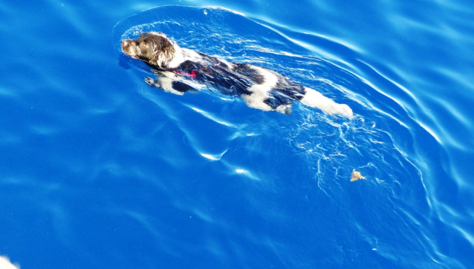 Ships dog Sirius checking out the water temperature in the Doldrums.