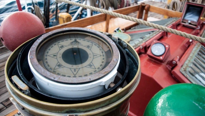 The ship’s compass is a liquid one, where the magnetised device is submerged into fluid to protect against excessive swing, improving readability and reducing wearing, mostly if they are mounted like on board ships, on a gimbal mount. First working models were introduced by Sir Edmund Halley in 1690, but they were improved and became usable on ships starting as late as 1813. And even it was not adopted as a standard tool aboard by the Royal Navy until 1908. As it is a magnetised device, it is affected by the surrounding metal, giving us a variation between its readings, the magnetic poles and the GPS true-north figures. Thus, they are usually located between two metal balls (green and red) and sitting on a pedestal that houses small movable magnets to counteract the effects of nearby ferrous materials, to compensate for external magnetic fields, making the compass more reliable and accurate and to allow corrections of this effect.