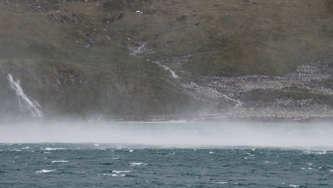 Blown out of Right Whale Bay by the morning strong gusty winds. Good anchorage and zodiac cruise at Rosita Harbour. English despite his name, Antoine de la Roche, has seen land here in a storm exactly one hundred years before in 1675. Arriving at la Roche’s coordinates he had taken, Cook found only fog. It cleared next day to reveal an iceberg, which in the mild latitude of 54ºS suggested high and cold land was closeby. It was first seen by Midshipman Willis, who was known for his heavy drinking, and possibly only on deck to relieve his bladder. The off lying island he saw is named for him and soon there was more, a long run of coast, with high icy mountains towering into the clouds, separated by steep glaciers. Cook wrote: ‘Not a tree or shrub was to be seen, not even enough to make a toothpick. I landed in three different places and took possession of the country in his Majesty’s name under a discharge of small arms.’ John Harrison Forgotten Footprints We had to wait until this morning for South Georgia to reveal its rough beauty, that remained hidden behind yesterday’s thick low clouds. We had rain, fog, swell, cold, and yet another of the island’s characteristics welcomed us today at Right Whale Bay: fierce gusts up to 45kn rush over the agitated seas, rising spray from its surface. At the background, majestic mountainous landscape, crowned by glaciers and snowfields descends and breaks off toward the sea in cliffs, waterfalls, bays, swell battered beaches and rocky capes. A scene worth to enjoy from the ship’s decks, but not to even try launching a zodiac for a landfall. Fur seals occupy all the shores around us, mingled with countless King Penguins. Many of them seem to entertain themselves jumping, swimming and plunging the rough waters and tempestuous conditions. At our bow, the panorama is completed by a long beach at the foot of a low laying valley, framed by cliffs nesting a large King penguin colony that climbs up the tussock grass slopes.