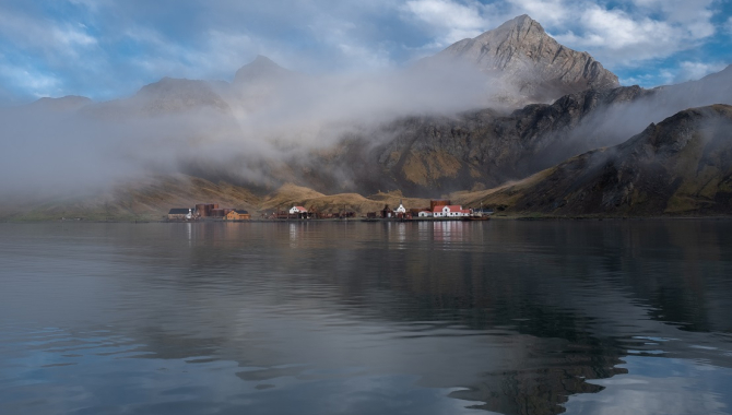 Rolling our way between Stromness and Cumberland bays, we arrive at the vicinity of Grytviken at night. Under Northeasterly winds, it is better to use the Eastern side of Cumberland to drift for a few hours until the first lights to get into Grytviken and drop anchor. Sunrise surprises us with fantastic views of South Georgia's highest mountains catching the first lights between veils of fog and low clouds.
