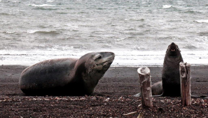 Due to the still strong onshore winds and instable weather it took a while to make the final decision of offering a long hike to Baily Head, located at the outer shores of the island, besides having another group to explore the decaying ruins of the whaling station. First ones to go ashore were the people interested in the long walk, followed by the rest. Short waves breaking along the shallow beach made the landfall quite adventurous and wet for all of us.