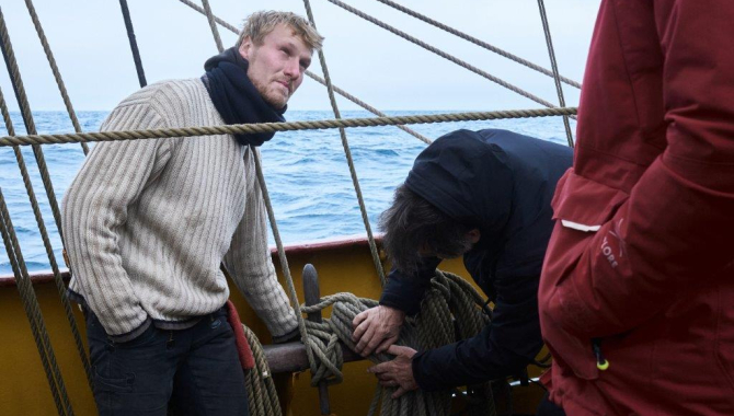 Crew climbs aloft and unfurl the remaining sails, down on deck we gather to brace the yards from Close Hauled to Broad reach and start setting all canvas straight away. 12 to 14kn of Westerly wind are enough fill them up, engines are turned off and the Europa sails again