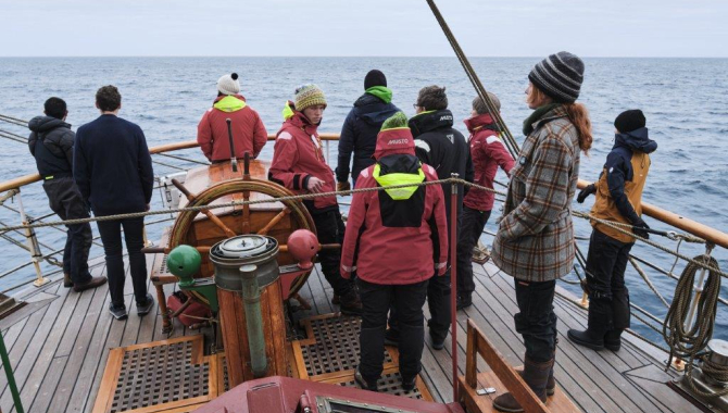 Sail repairs continue in the library, with both permanent and voyage crew stitching patches over the ripped and worn out areas of the Gaff Topsail. Weather, though overcast, hold pretty dry, and in the good and easy conditions, sail training keeps on going on deck, hands-on striking and setting sails, learning the how’s, do’s and don’ts. Lectures and seabird surveys keep busy the ones off watch. A steady ship translates too in a stable galley making the work there easier and allowing for elaborate meals.