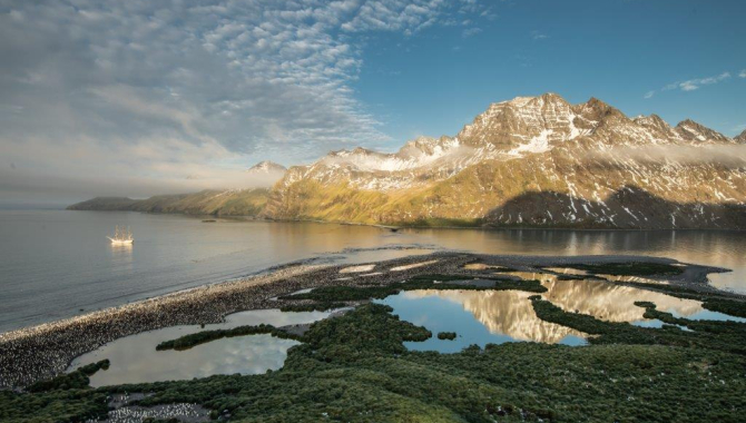 In addition to the landing site being notoriously difficult to reach due to this shallow area, often raging katabatic winds sweeping along, the exposure to the easterly swell and the density of penguins limiting the coastline where you can get ashore, stack the odds against you for landing. However, our zodiac drivers were able to get us to a section of beach that wasn’t crowded with wildlife where we could start our exploration. We wandered along the cobbed beach, enjoying the lowering sun casting a glow of orange across the landscape. There was a band of clouds at about 500m dividing the lower, green tussac covered slopes from the upper regions of shear rock faces and glaciated peaks. The lagoons, which were scattered across the promontory where we landed, were like mirrors exhibiting an upturned version of the scenery beyond. As the sun dipped behind the clouds casting shadows over us, Europa still shone bright out in the bay, holding the sun light a short while longer.