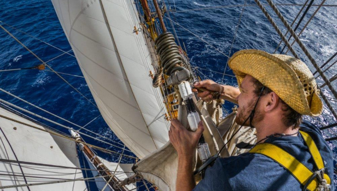 With 1570nm ahead of us and enjoying a great sailing day, the ship heeling to Starboardside, braced sharp on out tack, soon we leave the sea mount and the group of islands behind. A journey catching the good steady breeze of 15 to 18kn, but often having to face the passing rain showers, that repeatedly cross our path with their associated wind increases and changes. Skysails are lowered and set in a couple of occasions, same as dousing and pull up again the Flying Jib, and even a longer lasting squall made for a short while of sailing under the squares just up to the Top Gallants.