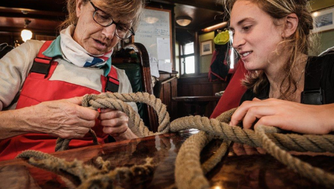 Windy and rainy night as we gain distance towards the Southeast. Wind keep blowing pretty hard between 25 and 30kn, slowly backing from E-ly to a more ENE and NE, allowing to keep steering on Close-hauled bending our course accordingly to the SE. Forecasted are similar wind conditions and even becoming more N-ly, fair for our purposes of gaining distance first to a bit higher latitude andthen direct our sailing efforts towards Cape Town. So far for almost our entire way from Tristan shores we have been braced sharp, Full and By and Close Hauled. This point of sail refers to whenthe course to steer is slightly upwind. With Europa’0s rigging and characteristics, trying to sail as close to the wind as possible we can keep her sails working to about 60º of the apparent wind, and that is how we are steering now on the continuous variations on the wind of several degrees.. Instead of every few minutes being given a course from the wheelhouse, now we learn how to keep the course on that way. No longer steering by the compass, at all times a crew member is giving us a hand to keep the ship high into the wind within this 60º limit, helped by the new display on the iPad we use for navigation, with its screen set at the moment for this purpose. Later during the morning, the NE-ly wind becomes steadier, allowing again to sail on a determined course. Still with blows shifting between 20 to 30kn, we keep sailing on reduced amount of canvas until the afternoon, when more constant winds allow first to set the Outer Jib and then the Top Gallants, adding approximately a knot to our speed. By dinner time Europa slightly pitches and bumps onto occasional larger waves at about 7.5kn. Later on, and as forecasted, the wind kept backing to become more N-ly, and the rest of the day is spent still keeping a course that follows it, braced close-hauled. In that way we are gaining terrain both Eastwards towards Cape Town but also Southwards. Like this we try to get off thearea more affected by relative High Pressure Systems, common at latitudes about 36º to 30º S, and try to head closer to the Roaring 40’s where W-lies are regular, fair to our intended course.The rainy and overcast day has carried also some stronger squalls, keeping the watches on stand-by on several occasions, in case is needed to strike the upper sails set and Outer Jib. And so it happened during the last hours of the day, when Top Gallants are clewed-up and furled, not to be set again in a few hours. After the wet watches on deck, while doing the lookouts and steering under the light rain, it was much appreciated that the permanent crew took over those duties so we could all attend our Second Mate Merle’s talk on navigation. Today she explained us about Collision Prevention Regulations at sea, quite relevant, at least for our lookouts, having in mind that we are gradually getting closer to South Africa and its main trading Ports, waters where Cargo and Fishing ships will be soon a common sight. After breakfast and lunch, the rest of Permanent Crew also met us in the Deckhouse, after gathering some ropes and gaskets for a workshop on rope-work, like splicing and whipping.