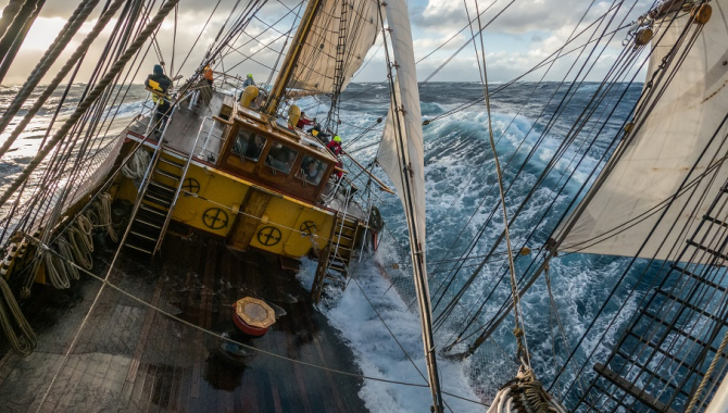 Powerful gusts up to 56kn related with the strong numerous showers make for bearing away as they pass by one after the other, associated with a frontal system of the Low-Pressure system where we sail. Maneuvers that require to be alert and an attentive eye must be kept all the time to assess the squalls and their force, while the waves come over the leeward board and crash against the windward side. Conditions that the Europa doesn't seem to dislike, an Old Lady ready to withstand the rigors of the high seas and tempestuous winds, where she wonderfully sails.