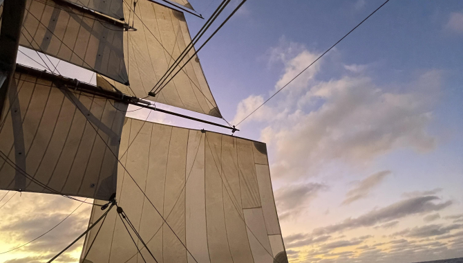 Good day,After motoring through last night, my watch today started with preparing for setting sails. That kept the voyage crew and the permanent crew busy until coffee time. After that the sails came up.Topsails, the forecourse, t'gallants, royals, the outer jib and......Stun'sails!So that in itself made this a great day, We were going along right greatly throughout most of the day. Now in the evening the wind, and with that our speed, went down to numbers that are nothing to write home about. But it is still enough to go forward, and the caterpillars get some rest.In the afternoon there was shipshoppie in the deckhouse, and we are preparing for pinrail-race on Sunday.Dinner was spagetti bolo and boterkoek for desert.