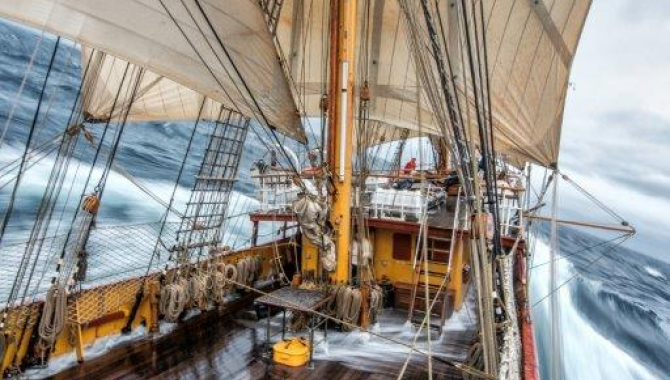 The forecasted wind shift expected by yesterday in the evening didn’t happen until early this morning, just before 05:00h AM. Before the shift, we sailed on easing breeze for a while, passing asquall line that came with rain but not associated strong gusts. Then, in a rapid change, wind backed all the way from NW-ly to S in about half minute, followed by a rise on its force, soon blowing againbetween 28 to 30kn. Time for some manoeuvres on deck to keep a good course and speed. A quick call for the watch was followed by wearing ship. First we come up on our course and start sailhandling. First sail to come down was the Spanker, followed by dropping Courses and Lower and Middle Staysails. Bracing came next, starting with squaring the Fore Mast, then bracing Beam reach the Main, and then finishing bracing the Fore. The sheets of the Fore Rig are pulled tight and the sails passed to the other tack. Setting the Courses came next and there we go, with the Europa on aStarboard tack speedy ride. 9, 10, even 11kn occasionally pop up on our GPS, running with the wind and swell on Beam Reach. Having the modern technology of iPad navigation program in front of uswhile steering the ship and taking the courses dictated by Mates and Captain, a quick glimpse at the magnetic compass can surprise us. The huge volcanic building of Tristan, rising all the way 5000m from the sea floor (2060m of them above sea level), contains magnetic ores that give rise to local magnetic anomalies resulting in the temporary deflection of the compass needle when passing close or over them. This shows as an effect permanently superimposed on the earth’s normal magnetic field and characterized by abnormal values of the elements of compass variation, dip, and geomagnetic force. The volcanic mass and its composition have a strong influence on the earth magnetic field of several degrees, increasing the normal magnetic variation (the angle the magnetic meridian makes with the true meridian) by 14º in the vicinity of Tristan da Cunha archipelago only settlement (Edinburgh of the Seven Seas), specially getting to anchorage site. The good sailing day and night, will mean an early arrival to the island shores. A good indication of having land not so far away is the presence of some coastal birds. Less pelagic than albatrosses and petrels, Tristan Terns and Skuas were spotted during the morning. The latter ones are a sub species of the Antarctic skuas, well known by all of us after the days we spent in the white continent and South Georgia, where theyare an every day sight. But Tristan’a ones are actually yet another of those island’s endemism, with their nesting grounds just restricted to the archipelago plus Gough Island. Same characteristics are followed by the subspecies of Tristan Antarctic tern, common visitors of the ships approaching the islands and usual companions while hiking along the coast. The increasing rough sea and wind conditions in the afternoon decreased the amount of wildlife sights, making for an afternoon when our decks were often washed by the waves, that also increased the rolling movements of the Europa. But nevertheless she doesn’t want to slow down her pace towards Tristan, keeping for most of the journey a good 9 to 10kn.