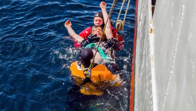 We don’t have horses on board, …no need to toss them over the side. We produce enough water to drink, shower and clean. We don’t count solely on the wind for our progress. We do have engines to keep on going over the calm sea and the windless area we come across, and we do have people on board who loved to “throw themselves” overboard on the “swim stop” we did today after the hectic moments following the performance of a Man Overboard Drill.
