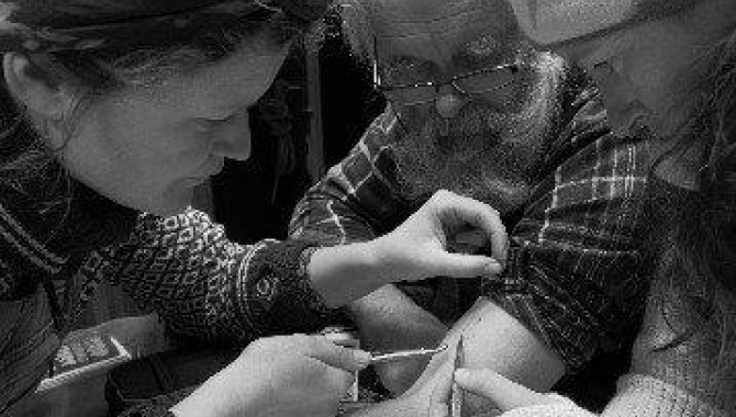The chart table in the library, being the main table of any size within the ship, gets used for many things. It has been the Jordi’s office, Merel’s shop, Natalie’s sail repair cutting table, Dan’s Zodiac repair workshop, the patient resuscitation table during a fire drill, and has been the launching pad for an unwisely unattended laptop or camera. I have even on rare occasions seen it used as a table for charts. Recently I’ve noticed Hans has been working with the guides – teaching would be a better description – to ensure that should an incident occur the team of doctor and guides would know what was available and where, and would work seamlessly and effectively together. This is a good thing. Even so, going in to the library this afternoon I was somewhat surprised to see the chart table had been transformed into an operating table. Sarah and Nilla were performing surgery on a foam scourer from the kitchen, under the intense gaze of the ship’s doctor. The good doctor was being thorough and prepared, and if the need to stitch a wound onshore arose, he would need a surgical assistant. And better to train the guides as assistant and practice with them beforehand than have to do at the time, surrounded by stampeding seals or psychotic penguins. And kitchen foam scourers are apparently good things to use for practice. So Hans had been stitching, and Sarah and Nilla took turns as assistant, pulling and cutting sutures at Hans’ behest as he stitched away. “But what if you’re not there?”, asked our resourceful guides. “Maybe you should show us how to stitch as well.” And thus it was that Sarah was stitching and Nilla was assisting, and the nasty gash in the scourer was being repaired to the undying gratitude of the galley crew. But any zombie will tell you that scourers can only go so far as a substitute for human flesh. Hans felt his students needed to take the next step. As the boat rocked gently from side to side, he rolled up his sleeve, got out his blue pen and drew an imaginary wound on his arm…