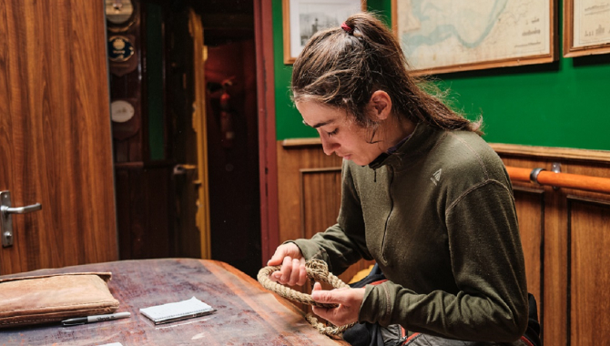 The good sailing continued for the night and the early hours of the new day. By then, the Westerlies become 15 to 18kn of Southwesterly as we steer northwards braced Close-hauled at a good speed. Clouds in the horizon, change on the barometer readings, growing seas from the Northwest. Well learned on reading the signs that foretell the coming weather, in the morning the Captain asks to reduce sail. Soon we loose the fair winds and the sunshine for Northwest and North-northwest headwinds, overcast and drizzle. All Squares are clewed up and furled, swift hands pull on the Middle staysails downhauls and pack them away, also the Outer Jib, Desmond and later on the rest of headrig and staysails. Motoring then against the 30 to sometimes gusts of 35kn of wind, Europa pulls up 2 to 3kn of speed on her way north, with an Eastwards leeway due to the strong current that flows clockwise around the Antarctic Continent. Those northerly winds brought also a slight rise on the temperature, not feeling anymore the intense chill from the south. Forecast tells about a few hours of those conditions before the wind shifts again to allow sail setting. She will have to get through the winds blowing on her nose and the crashing waves, just facing it under engine. And she rolls and pitches and heels on the Drake Passage swells. It is difficult to walk around the ship, have a quiet meal, dry the wet gear. We all had some time to embrace her movements and the life on board, it is not like when we freshly embarked and braved the way south a couple of weeks ago, but nevertheless seasickness strikes on some once more. It will take again some time to get used to the constant motion of the ship in the stormy waters. For the many interested that overcome the motion sickness, the daily bird survey project whilst at sea, continue on deck. Today less albatrosses and petrels show up, maybe feeling too the weather change. No matter the meteorological situation, maintenance projects keep on going on deck and aloft. A rig like ours in good working order requires time and dedication, rope work, changing lines, place and replace chafing gear, stitching sail repairs and many other jobs of the sort. Outdoors and indoors as well. Officially a library, often a sail loft repair, lately a drying and inspection area for lifejackets. They too have endured days in a row of rainfall and sea splashes keeping us safe on their rides back and forth ashore in the zodiacs. During the last 24 hours, the good sailing first, then the use of engines full-on facing strong winds and swells, under both sunshine and rain, getting to grips with the Drake Passage volatile mood, have positioned us 109nm closer to our destination. Having started the oceanic crossing further south than Europa’s entry point to the Antarctic islands at the beginning of the voyage, that progress position us at a latitude just above King George Island, and still South of Elephant Island, the northernmost of the South Shetlands.