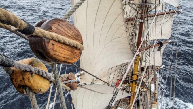 From then on just Middle and Upper Staysails remain set, together with Spanker and Gaff Topsail at the Mizzen Mast and all jibs in the bowsprit. After dinner Desmond flaps over the Main deck and the Flying Jib over the Jib boom, so they are taken away and furled.