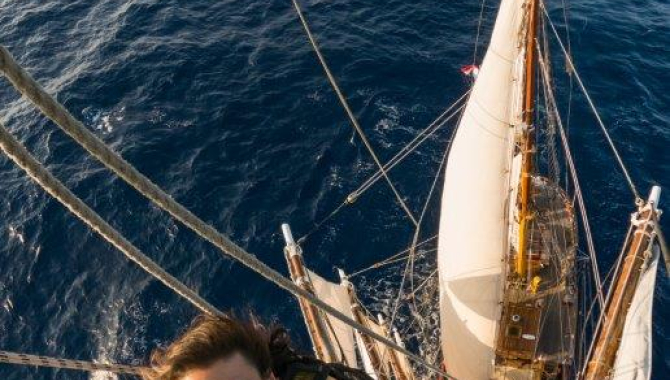 After Neptune’s and his court visit on board, now one, then two Great skuas started to follow the ship. Sure the smell of the secret potions and rotten fish brought on board by them to initiate the Pollywogs to his kingdom has something to do with it. The largest and more powerful of the predatory northern skuas, breeding in oceanic islands all the way up to Spitsbergen, but dispersing southwards from August onwards, seem to enjoy flying with us and look around the decks with interest flying on several occasions right above our heads in the Poop deck. Neptune -borrowed by the Romans from the Mythological Greek god Poseidon- sure is the venerable god of the sea and water, but also from earthquakes, like the tremors he leaves behind as a result of his admission and baptism rites… and the mess after them. His visit on board ended up with a clean up that lasted until the evening, when an impressive full moon rose at the East while at our Starboardside we could enjoy yet another beautiful sunset. Anyway, party, mess and all, Neptune is always welcomed on board “his brother’s Zeus ship, the Europa”, which proudly carries a figurehead of him, transformed in a white impressive bull, courting the princess of Tyre Europa, offering her a ride to Crete, where she bore him three sons (Minos, Rhadamanthus, and Sarpedon). From now on, we will be sailing in the Southern Hemisphere. Not just this but also the autumn in the Northern Hemisphere has transformed into Spring. The part of the earth that is directly aligned with the sun, receives the most heat. The poles, being at a very flat angle, receive the least heat. As the year progresses and the earth rotates around the sun, it tilts on its axis. This tilt changes the area of maximum heat absorption from the Northern Hemisphere to the Southern and back again—hence our seasons. On board the switch of hemisphere and season is welcomed by starting to add again more canvas to our rig. Once the electrical system of the Main Skysail Mast has been checked and overhauled, is time to hoist it, rig its yard and bend-on the sail. A process that sure will take a couple of days involving permanent crew from both watches. All happened today while sailing nicely well up the wind, enjoying the fair SE-ly breeze. 97nm done during the last 24 hours in a good 205º course, making a total mileage sailed from Canary Islands of 2063nm.