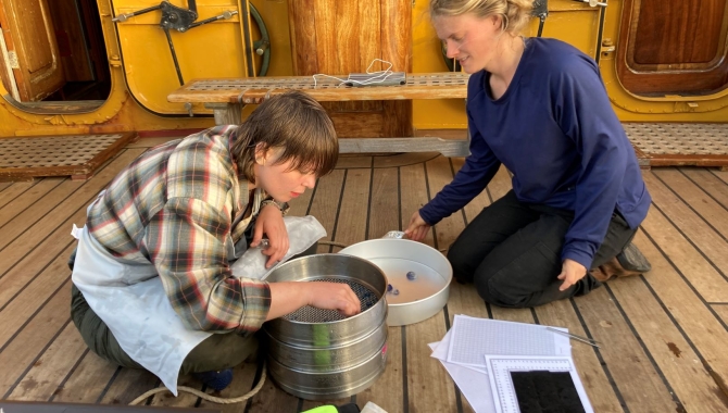 We have the great luxury of having two scientists aboard. Abigail and Marretje both use the “manta-trawl” to collect specimens from the surface of the ocean. While Abi is mainly concerned with the amount of plastic in the specimen collector Marretje is researching the living catch. After the whole contraption has been brought aboard again together they wash out their “treasure” on deck and start making an inventory, count and explain to us all what we see. It is amazing what kind of life exists in the upper thirty centimeters of the mid-ocean waters.