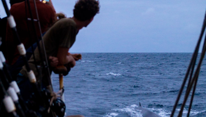 As Laurent diligently sorts the sparse catch in search of plastics, Gjalt appears from the galley- perhaps in search of something to cook? He loves the teeming life of the ocean, and he is the first to tell when something is spotted. Today, we poke at almost microscopic violet snails, crowned sea bells algae, and trusty velella velella(by the wind sailor). Our prize catch is a flying fish- a juvenile of about 1 cm in length. Gjalt is impressed, unperturbed by our miniscule catch.