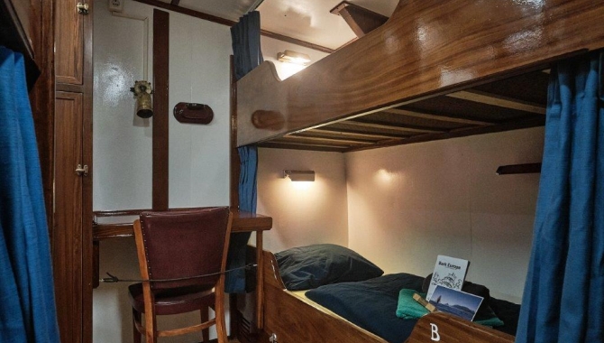 There were 4 bunks to choose from. I usually like to be on top (don’t.), so I wanted to try life in a lower bunk. I would no longer need to feel as though I would fall out of bed on the wrong tack or have to clamber in and out of it with about as much grace as a voyage crew trying to pour milk onto their cereal whilst holding a coffee and a camera. Gjalt and I could even wave at each other from our new beds!