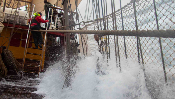 It is easy to write about all the daily things that happen to us. Games, soup of the day, that sort of thing. It is much harder to describe the feelings coming over us. But I can describe the scene. As the days have gone by the color palette of the ship has changed. The warm and comforting yellows which do so well on camera are being exchanged for a darker sky. It is time to put the sweaters back on- the swimming stop of days ago feels like a distant memory. The storm had been building up, growing, with the climax arriving yesterday. The watertight doors were closed, Lotte and Cato had to prepare meals that were less likely to fly out, and harnesses had to be worn on deck. And above all, 6m high waves were gushing over the railing.