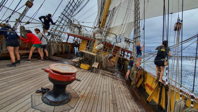 But soon the weather situation was about to change dramatically. Clouds stated to cover the blue skies before midday, and by lunchtime the wind rapidly increased from a SE-ly direction. While blowing 20 to 25kn, together with rain and growing swells, permanent crew and the voyage crew members that were up to some excitement, meet on deck to reduce canvas.