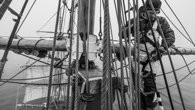 Low clouds came with rapidly increasing Northerly winds and rising seas. From the early morning onwards, hands are called on deck to gradually douse canvas and some keen ones ventured aloft to help the permanent crew furling them. By the afternoon, the Europa has reduced sail to just Upper Topsails, Inner jib, Aap and a storm tri-sail set on the Mizzen. Both with the idea of reducing our speed and to be ready for even stronger gusts that have been blowing at 30 to 35kn. Eventhough South Georgia is at hand, the wind force and direction doesn’t represent a good option to approach the exposed and rocky northern coasts of the island. With no good shelter to be found on that situation, it is a better deal to brave those rough conditions a bit offshore and wait for the wind shift predicted for later at night in the forecast. All an all, not a great surprise and more of a “welcome to the reality of South Georgia”, where this weather, winds and seas are not at all unusual.