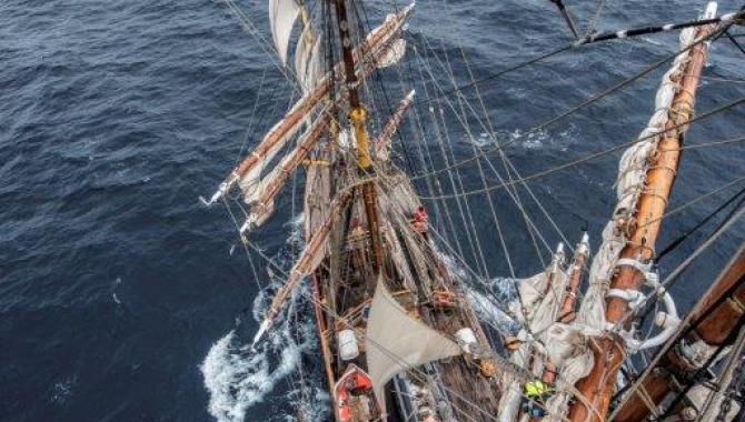 At dawn good winds from the NW, blowing between 15 to 20kn helped our progress allowing for setting all our canvas under the overcast and snowy skies. With that Europa makes her way following a 230º course on the northern Weddell Sea, having a great sailing first hours of the day. The ups and downs in the wind seem to announce a big change that actually happened just after midday, when first it increases over 30kn just to suddenly back about 40º, asking for a hectic pre-lunch hour of sailhandling. Under those conditions first the higher staysail, the Vlieger comes down and is furled but almost at the same time is decided to clew up all the squares and furl them. Engines roar again pushing us deeper into the Weddell Sea in the direction of eastern Antarctic Peninsula. After lunch the weather was already much better, with the sun shining amongst the high clouds, allowing for great views of several Fin whales close to the ship. The sights of these huge whales just kept increasing during the day until we end up finding a feeding pod of them after diner. The group counts up to 30 individuals spread over a large area. Some of their high blows and large backs crowned by their typical dorsal fin can be seen next to the ship, while a look at the open waters towards the horizon reveals many more of them. Fin whales are the second largest whales in the world, right after the immense Blue whales. Their preferred areas to aggregate during the polar summers are the deep waters close to the continental shelfs, where the sea floor rises steeply as getting closer to the shallower depths near the coasts. Being at about 50nm from our goal, Danger Islands, and with that, to the shores of Antarctic Peninsula, looks like we found ourselves in one of those areas. Between them a handful of Humpback whales share the region, though they are encountered in greater numbers closer to the continent in shallower waters. By that time, we had already changed the tack of the Staysails to Starboard, during the afternoon, as the variable winds had come all the way to SW-ly with a tendency of decreasing. And at the end, after diner, while enjoying the great sights of the heaps of whales around, all remaining sails set are taken down and furled. All under a setting sun that promised for a great dawn light, as we got a bit later, when tabular icebergs could be seen in the horizon, bergy bits are scattered around, even one of them being used as a temporary rest stop for a couple of Adélie penguins. Now under engine we eat away the few miles that separate us from the firsts islands, east of Antarctic Peninsula, called by the appealing name of “Danger Islands”. This small archipelago has for a long time been sought by our guides, who never had been there despite the several times they had tried. Other seasons they have been stopped by large amount of sea ice, that this year seems to be greatly reduced. But for sure its concentration will increase during the night as we get closer to them, where we plan to arrive in the morning and try our luck for a landfall. The archipelago is known by its rough beauty seldom visited and for being home of the largest rookeries of Adelie Penguins in the East Antarctic Peninsula.