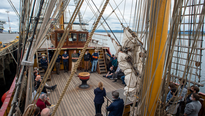 Bark Europa has been for a short while alongside the busy port of Ushuaia since the end of her last voyage, and is also from here where we will start our journey. Luggage already on board and in the cabins since yesterday, before going downstairs and unpacking, we were welcomed on the Main Deck by our Captain, Janke, and her crew. Meeting followed by lunchtime and time to get acquainted with each other and the ship.