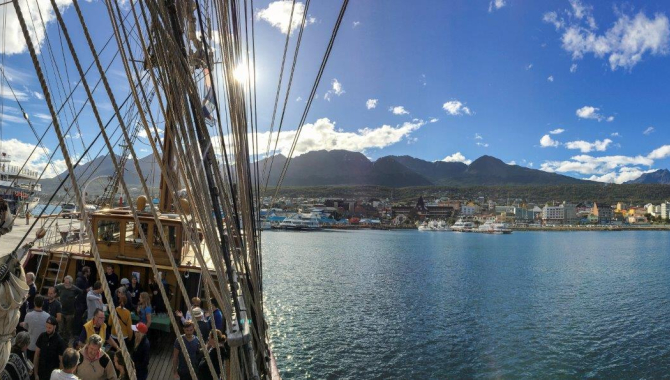 Europa was alongside the main Ushuaia harbour, dwarfed by numerous of the bigger Antarctic-tourism ships that met here today. As the only sailing ship of her kind in the pier, she always attracts the curiosity of their crew and passengers. As a general procedure they use to spend just a few hours in port, all departing for their trips in the afternoon, like this, gradually the crowded port becomes less busy while we all check-in on board and are properly welcomed on board by Captain Klaas and his international crew of 17. After diner everybody attended the briefing where we started being familiarized with the Europa and her particularities, our duties on board to develop during the trip and did a safety walk through the ship. Good way to start having an overview of the long journey to come and the system we will follow during the next 52 days. With all this we all start realizing the effort required to put together a voyage of this sort on a Tall ship built in 1911.