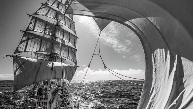 Now after the rain and veering winds, we find ourselves again under the sun and calm conditions. The seas are good, the ship gently rolls sailing with the breeze on our backs. Good conditions for hands-on sail-training outside and maintenance jobs both aloft and on deck. Until nighttime when we ride again the fair westerlies at northern edge of the next upcoming system located south of us.