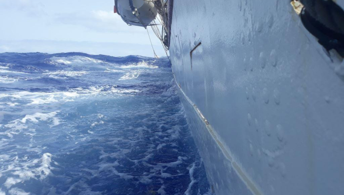 We still have a swell of around 2,5 meter and the port scuppers are filled.