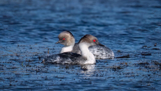 Next to the farm, a large pond offers top-quality birdwatching. Here, Brown-hooded and Dolphin gulls nest, together with Magellanic oystercatchers, Pintails, Speckled teals, Upland and Ruddy-headed geese. But without a doubt, the most interesting one is the rare Silvery Grebe. This striking-looking little bird is characterized by its shining white fore-neck, contrasting with its jet-black beak and face, in which is set the piercing red eye that gives its glare a somewhat demonic quality! In the summer, a fan of gold plumes behind the eye adds further to the dramatic look. They are sociable and nest in small colonies with pairs settling within meters of each other on large ponds. We saw the Grebes attempting to gather seaweed in order to build a nest… this couple was having debatable success, but others must have developed a knack for it and are able to use the pond vegetation to make a habitable nest. They dive frequently, staying down for an average of 20 seconds before resurfacing. Though sociable, they are apparently not chatty as they are usually silent apart from some twittering or squeaking while nesting. They come to the ponds from September for breeding, but during the winter, inhabit coastal kelp patches. The Silvery Grebe is not such a common sight here as they are not numerous in the Falklands, though there is a small resident population. Larger numbers are usually found in Southern Chile and Argentina.