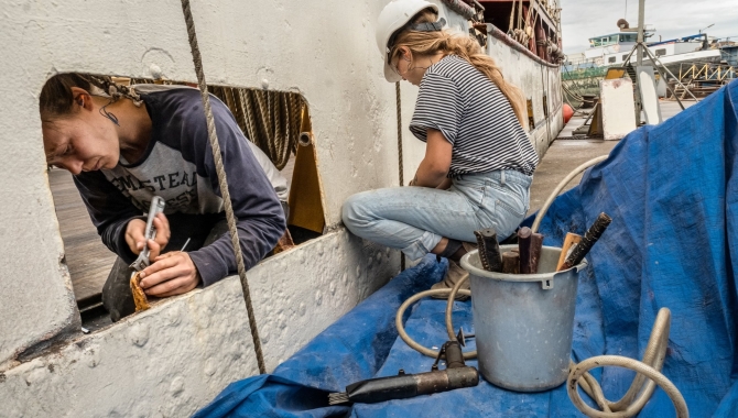 Gathering on deck or sheltering from the rain in our deckhouse, is how the day starts. Early morning coffee in hand, the daily works are designated and crew in no time crawls into the depths of the Europa, while others are busy out on deck or in the canvas tent pitched next to the ship, where the carpentry work happens.Thereβs already no lack of jobs to do, some easier than others. But the more you take the time to have a good look around, an always rising number of repairs appear, both below decks and outside if the weather allow for rust busting, grinding and painting there.No doubt the largest undertaking for now is checking and replacing some of the seawater piping in the engine room. Seemingly unreachable tube sections and jammed bolts are the usual conversation with the ones involved in such arduous task. Meanwhile another team is in charge of taking apart the whole of the dry-storage area, leaving behind them the bare hull, ready for a deep clean-up, new layers of paint and a full refurbish. Tough mission too, as its shelves were built to last. They actually have been solidly holding our supplies for well over two decades, putting up with whatever seas and weather conditions the ship has endured all over the World Oceans.All big or small duties; challenging, strenuous or easy maintenance and repair projects, all together carried out by a crew with the hope of seeing the Europa sailing in a near future, longing for once more pulling on her halyards, braces and sheets, setting sail for new adventures to come.Jordi